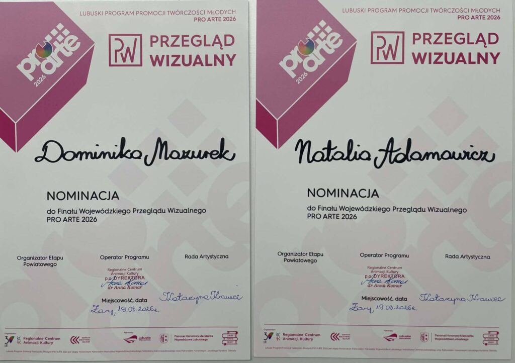 otrzymały nominację do kolejnego etapu w ramach Lubuskiego Programu Promocji Twórczości Młodych PRO ARTE 2026!